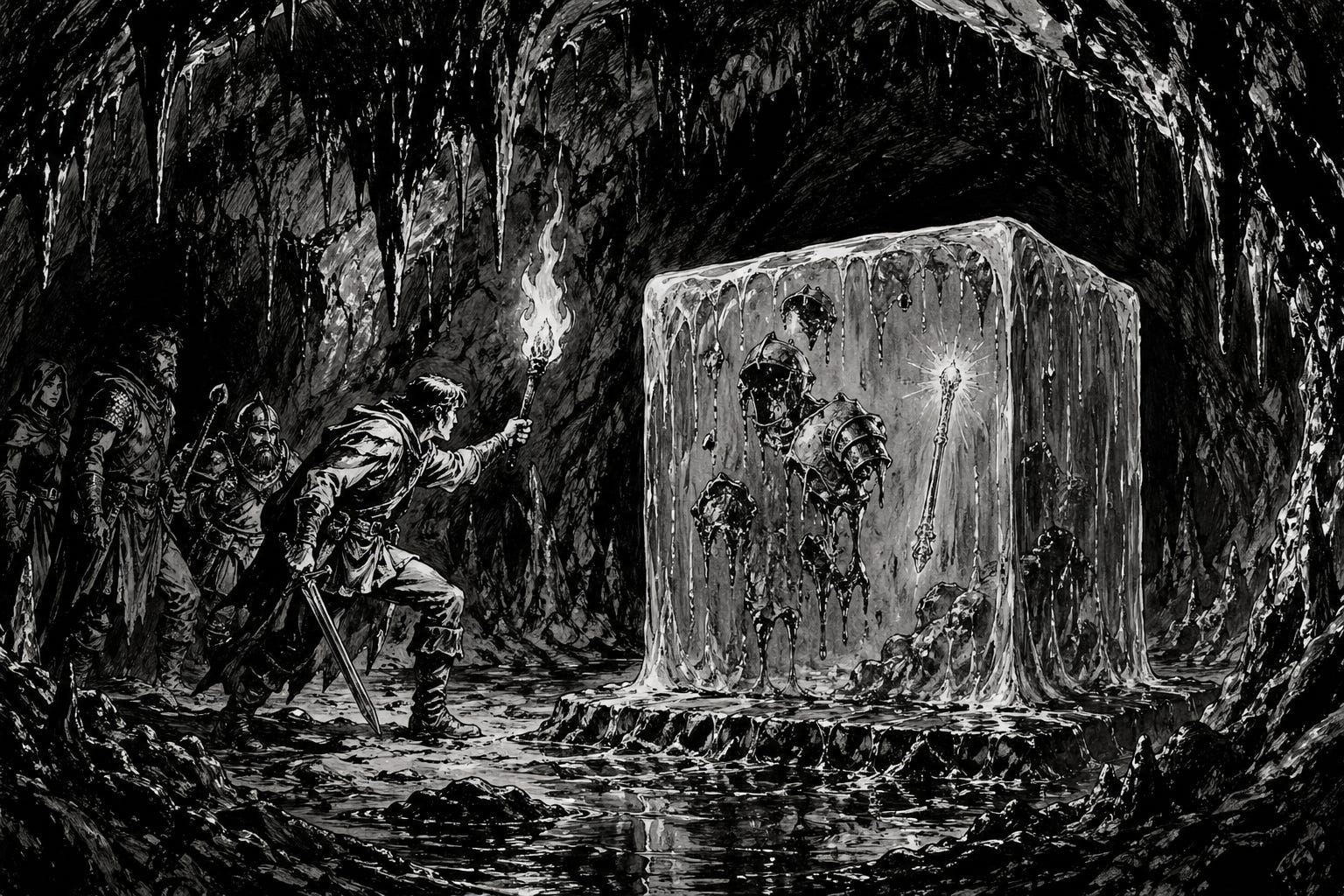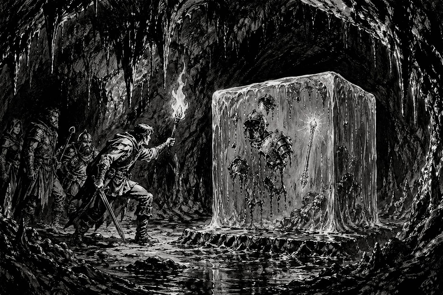 Second, timing. A cube only works if the party enters its space. It is slow. It needs the players to come to it. So the cave has to funnel them. A side passage, narrow and wet. Maybe something is chasing them deeper. Or something valuable lies behind the cube. Let them see the prize first.
